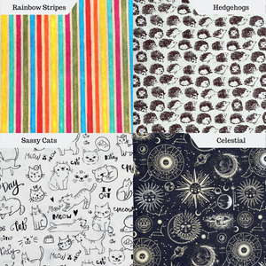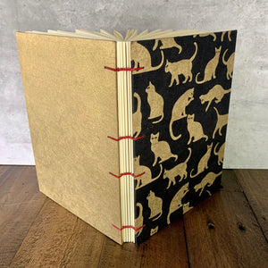 The front cover features Fair-trade handmade paper from Nepal, in your choice of a fun print; the back is covered with a complementary gold. Coptic stitch binding, with an exposed spine which lends itself to a more lay-flat writing experience. Stitching is done in a coordinating Irish waxed linen thread. The pages are acid free, 70lb., text paper. These pages take gel pen, ink or light color washes well.